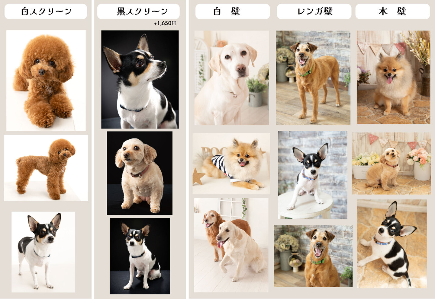 ※「おすわり」「ふせ」などわんちゃんへの指示はお客様にお願いしております。撮影のご協力をお願いいたします。